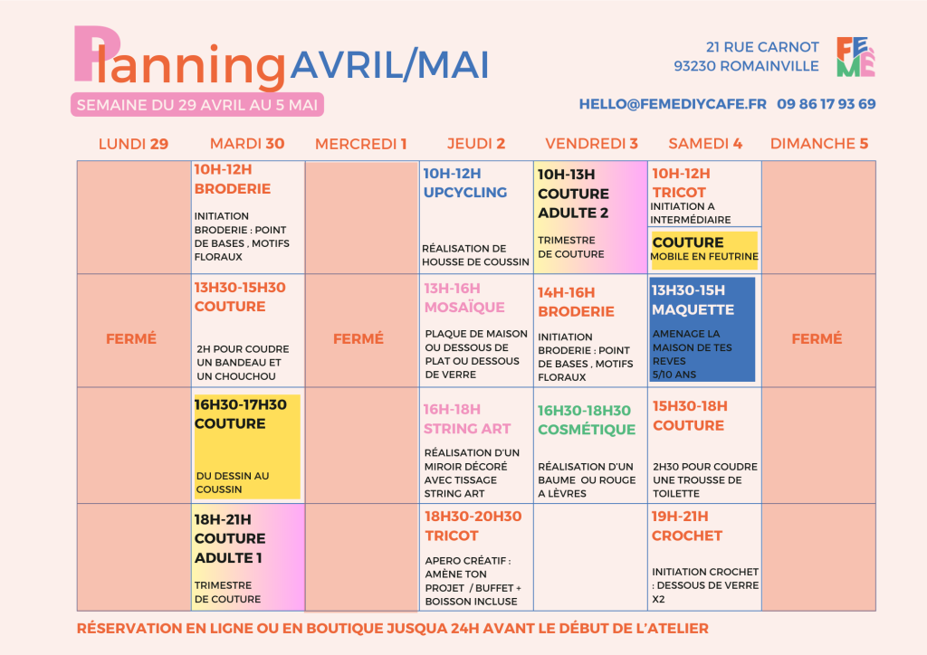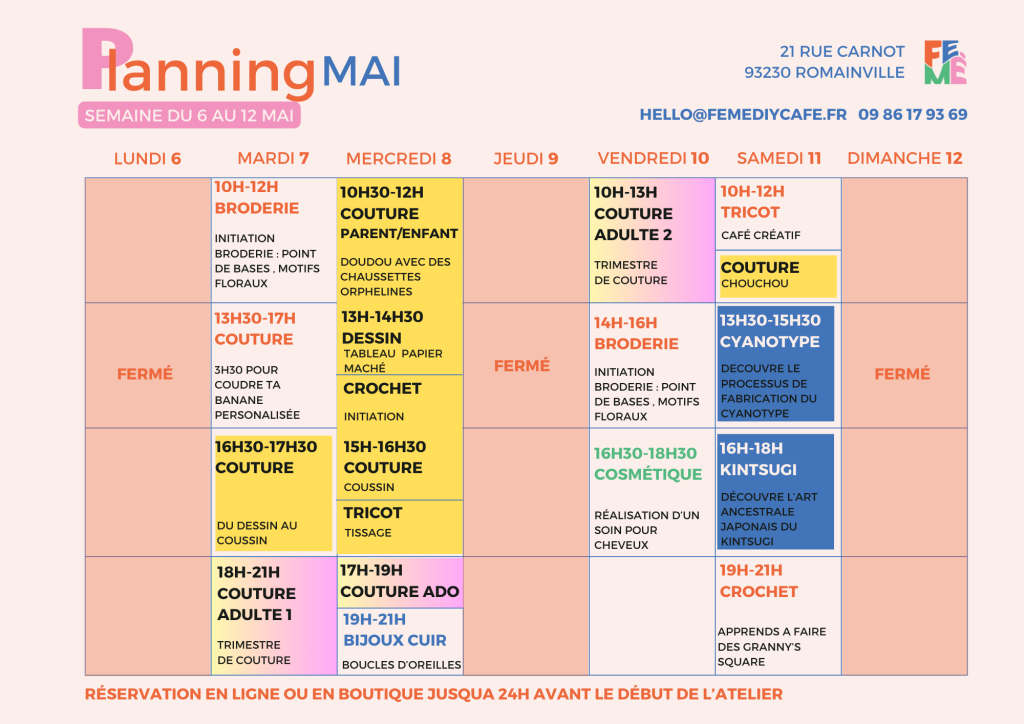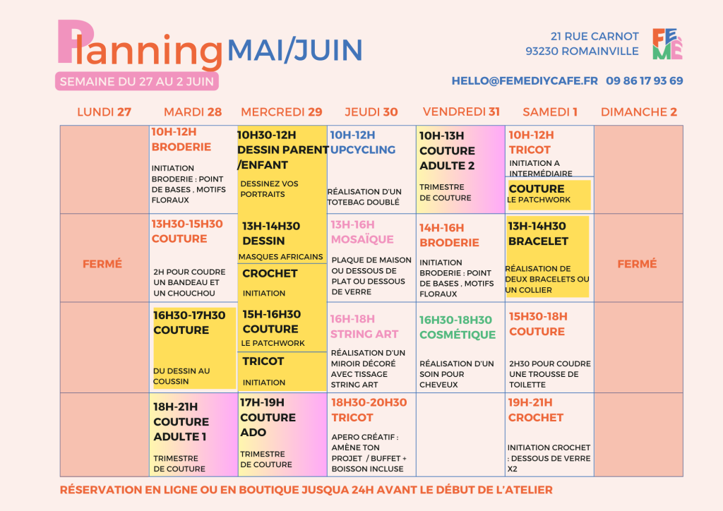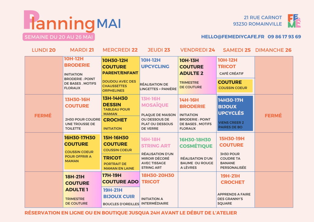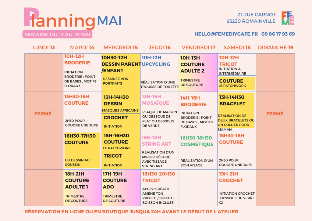 Découvre le programme d’atelier du mois de mai chez Fe.Mè DIY Café.