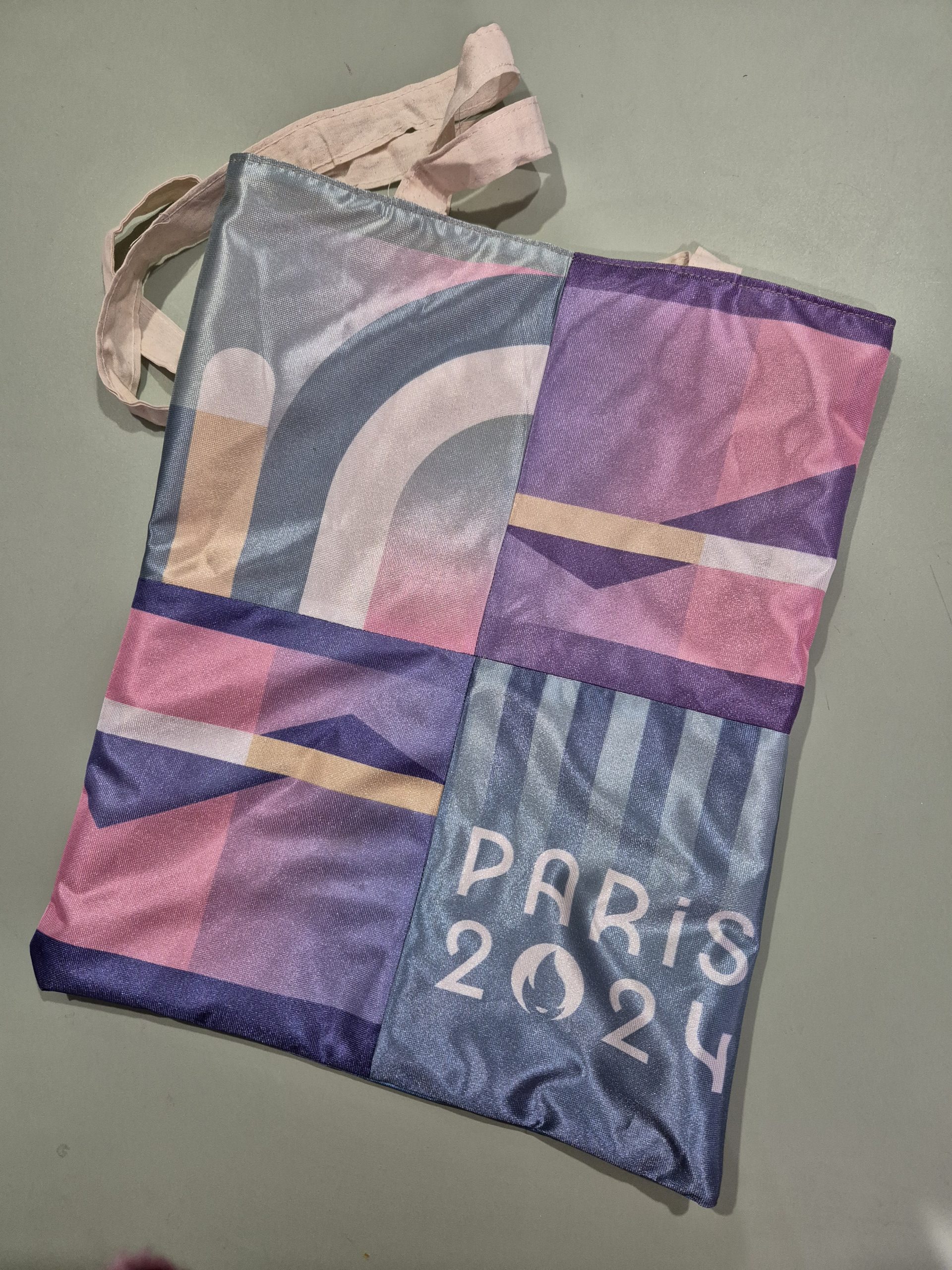 Découvrez notre totebag unique, fabriqué à partir de fanions récupérés des Jeux Olympiques, avec le soutien de la mairie de Romainville. Chaque sac est une pièce exclusive, alliant style et durabilité. Pratique et éco-responsable, il est idéal pour vos sorties quotidiennes.
